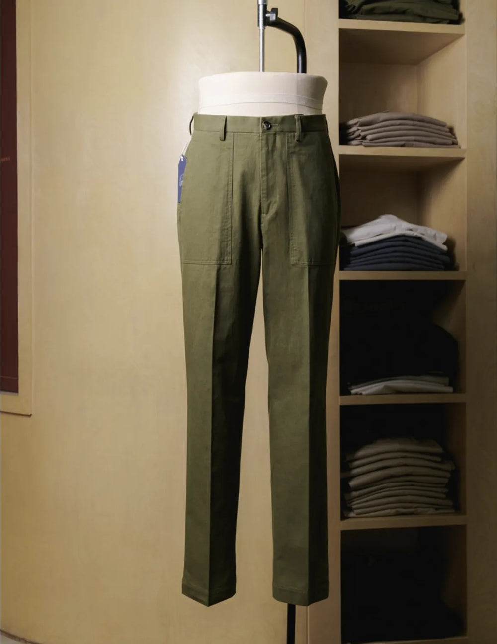 the fatigue pant, also known as "baker pant" or "og-107" because of its original color "olive green" was introduced by the us army in the 1950s as a lighter, more practical and more comfortable uniform pant. the 1333p is barnstormer’s dressier interpretation of these trousers with the 4 patch pockets. the dress fatigue is made in japan from japanese herringbone cotton fabric and features a slightly higher rise, a relaxed tapered leg and many details you rather know from suit pants. definitely the most elegant fatigue we have seen so far.