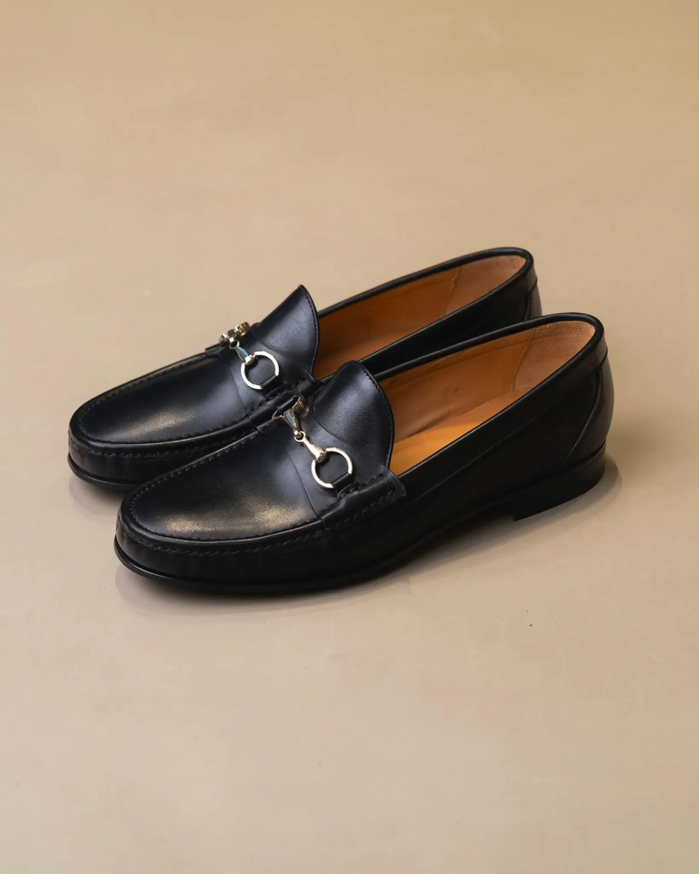 Introduces the Horse Bit loafer, a classic loafer style that works for both casual and semi-formal wear. This model, made from premium black box calf leather, is crafted in Spain with expert craftsmanship. The smooth box calf finish offers a polished appearance, while the signature horse bit hardware.