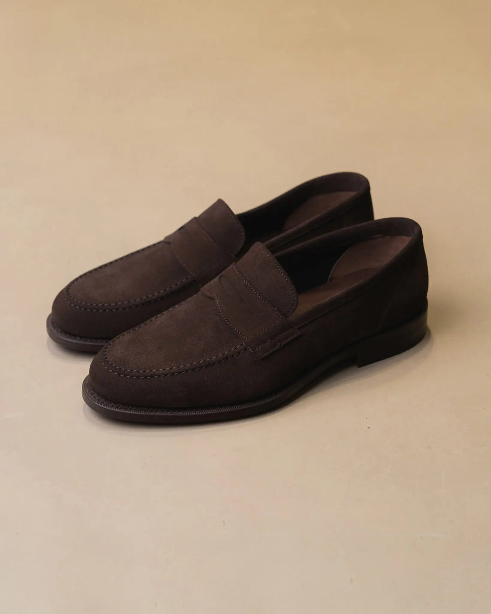 The Berwick Penny Loafer, handmade in Spain with traditional Goodyear Welt construction, is crafted from premium dark brown suede. Featuring a classic penny strap and unlined design for lightweight comfort, this loafer offers durability, breathability, and versatile style for both casual and semi-formal wear.