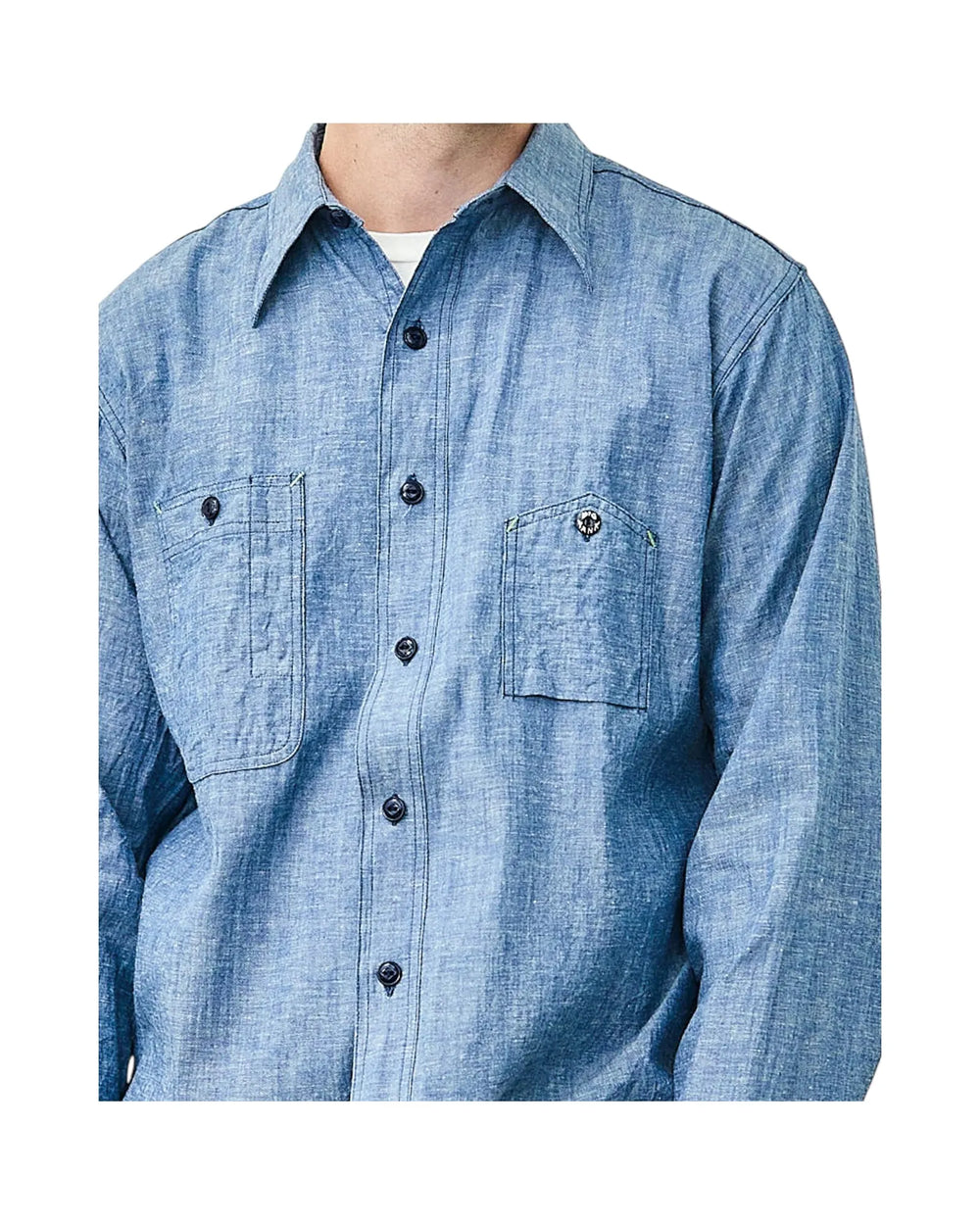 This 1940s model features BIG YANK’s iconic left chest pocket, commonly known as the “mountain pocket.” Its distinctive pentagon shape combines striking visual appeal with functionality, perfectly representing the beauty of utility. The asymmetric pocket layout, known as “gacha pockets,” is unique to BIG YANK. The right side features a cigarette pocket, trademarked in 1942, while the left chest has the signature mountain-shaped pocket. This design reflects both practical workwear needs and visual balance. A small metal button at the top adds durability while acting as a subtle accent that sharpens the overall look of the shirt. The cuffs are designed with storm cuffs, eliminating the traditional placket to prevent snagging during work. On the back, the strain proof yoke helps reduce tension when leaning forward, ensuring comfort and freedom of movement. Every detail is rooted in functionality for the workplace. The shirt is made from Japanese 20×30 selvedge chambray, sulphur-dyed for a vintage look. The fabric has a soft, natural texture that develops unique character over time, making each shirt truly personal.