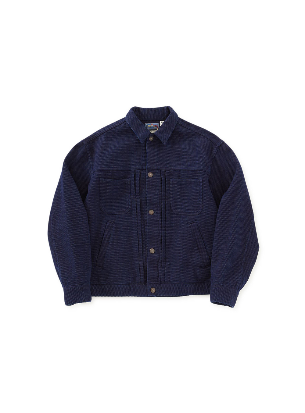 This jacket is based on an authentic denim jacket. It is made of genuine indigo yarn that has been dyed with a skein, and is characterized by a slight unevenness that runs vertically. By double weaving it on a dobby loom, it can be made thick and elastic without becoming heavy. The process of dyeing the yarn and the process of weaving and finishing the fabric are dried without using high heat, resulting in a soft and fluffy texture. Honai Sashiko, which has been used as a representative material of BLUE BLUE JAPAN. In pursuit of an even lighter feel, the number of weft threads has been adjusted from the conventional fabric.