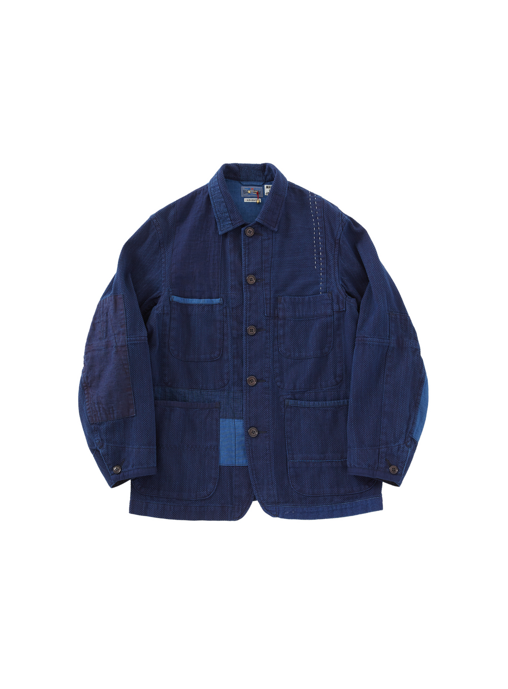 Based on a 1970s work jacket, this coverall is made by layering various indigo fabrics on expressive sash-dyed sashiko and hand-stitching. We use original sashiko fabric made with threads dyed indigo using a technique called kasezome, in order to achieve a light feel like a shirt. The kasezome thread changes color for each sash, so it is characterized by unevenness that appears in vertical lines when woven. You can enjoy the deep color fading even among indigo. It has red selvedge, which is unique to power looms, and has a soft and plump texture. You can enjoy the aging of various “blues” along with the cotton indigo fabric used as a patch. The shoulders have a moderate fit, and the silhouette is loose from the body to the hem. The fabric on top is the indigo fabric that BLUE BLUE JAPAN has been using until now. The indigo colour of the base Kasezome sashiko and the indigo colour of the various patches will each have their own unique characteristics and will change over time to suit the wearer’s lifestyle.
