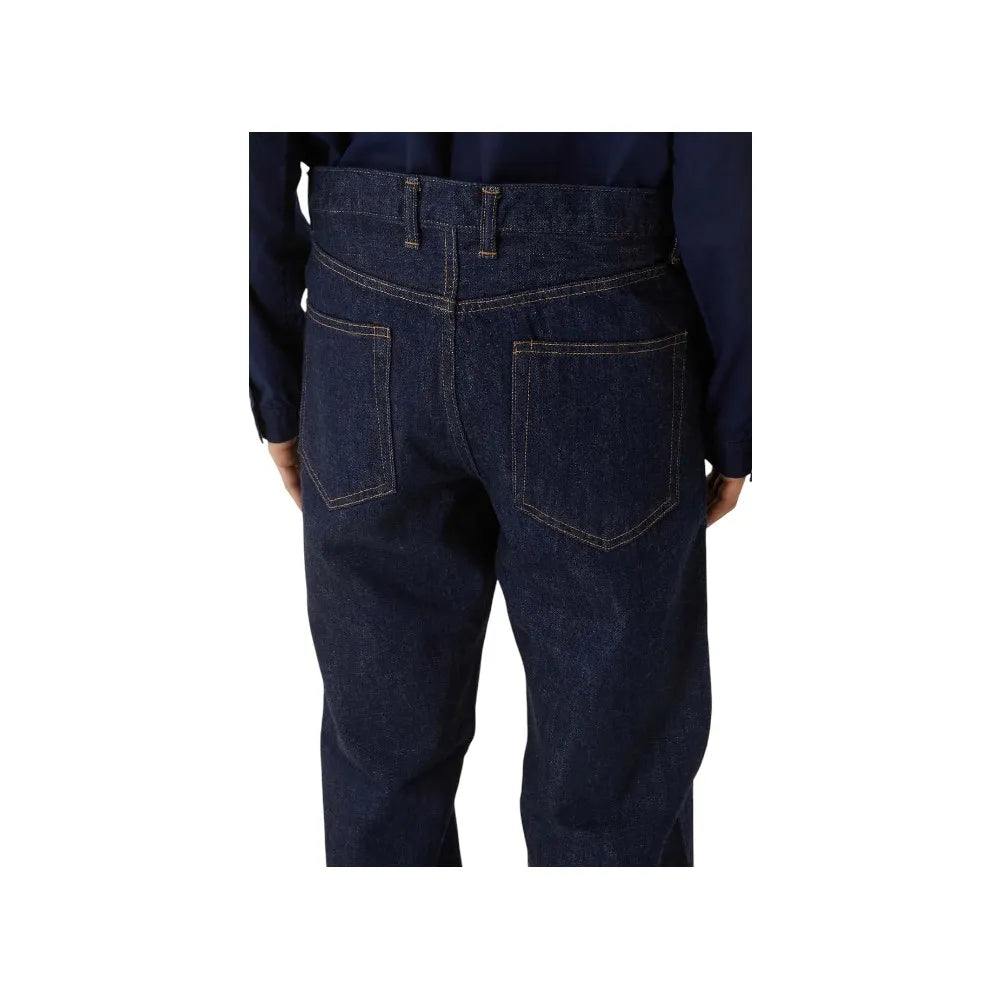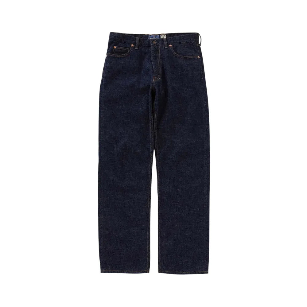The dark blue color is just one wash, so you can enjoy growing it yourself. The rise is not too deep, and the silhouette is slightly thick and straight. We also recommend going up one size for a relaxed fit.