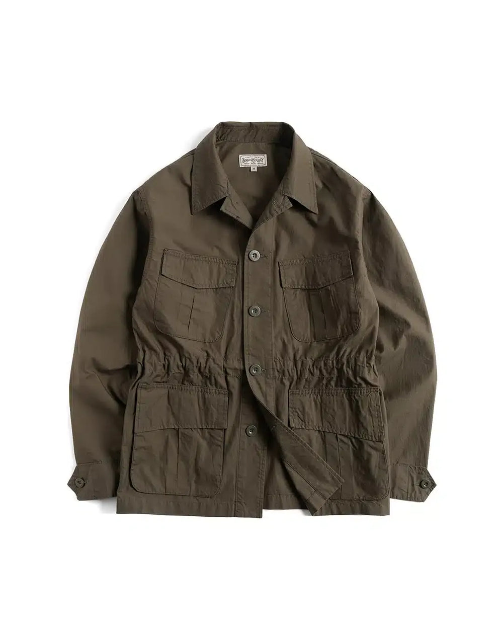 This is a Buggy Holiday military jacket made by combining outerwear designed for past safari trips and a Jungle Fatigue jacket. It goes through the Garment Washing process to provide a comfortable fit and a natural mood. It is an attractive item that can break the boundaries between casual and formal, which goes well with casual styling, as well with dressy pants, shirt, and tie.