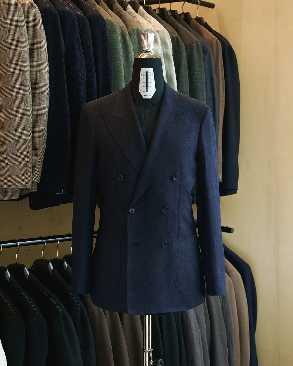 Sport Jacket Collection by Drop6 Crafted from breathable linen in a subtle herringbone weave, this double-breasted sport jacket blends structure with ease. Unpadded shoulders and a soft silhouette give it a natural drape, ideal for warm weather and smart-casual looks.