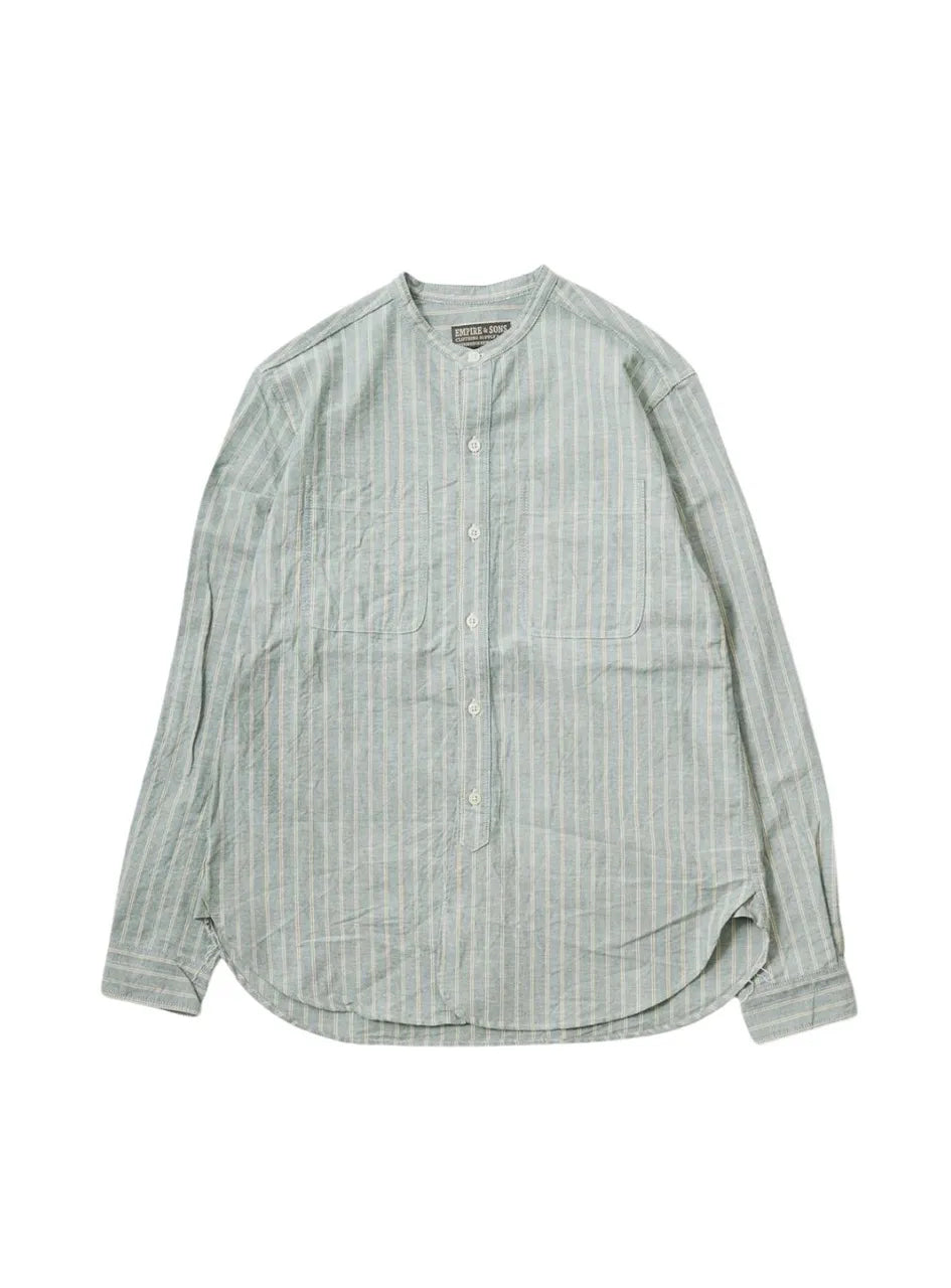 EMPIRE&SONS L/S CLASSIC BAND COLLAR SHIRT VINTAGE OXFORD. A band collar shirt made of striped Oxford fabric. Exquisite fabric with classic colors and texture. The low stand collar is like an old military detachable collar shirt, and the sides of the body are double-stitched for durability. The buttonhole on the back of the stand collar, a relic of the past, remains as part of the design. It has patch pockets on both sides of the chest and a casual silhouette like a work shirt with no waistband. It is a piece that you can enjoy as it ages with wear.