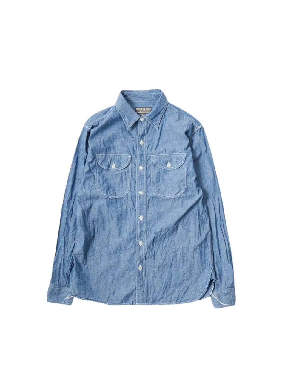 EMPIRE&SONS L/S UTILITY WORK SHIRT 5oz ORGANIC COTTON SELVEGE CHAMBRAY. A work shirt made of chambray material, inspired by the US military utility shirt. Large collar with triple needle stitching. Rounded patch pockets with flaps on the left and right sides of the front. It has been pre-washed, giving it a nice creasing effect. The more you wear it, the more it will fit your body, and you can enjoy the changes that occur over time.
