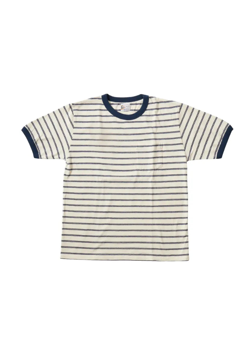 A crew neck short sleeve pocket T-shirt made of striped cotton material. A piece with a chest pocket, which is an iconic detail of FELCO, with a firm binder neck collar and ribbed cuffs. A natural silhouette with a soft fabric texture that is not too narrow or too loose and has just the right amount of room. Of course it can be used as an outer T-shirt, but it can also be used as an inner T-shirt for coveralls and shirts. The striped pattern will add an accent to your styling.