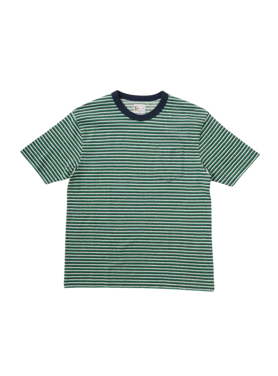 A crew neck T-shirt with striped pockets. The neck is binder style. Set-in sleeves. Patch pocket on the left chest. A boxy silhouette with roomy width. The fabric is made of soft, comfortable cotton. It is mid-weight (medium thickness) and extremely comfortable to wear. It can be worn alone or as an inner layer.