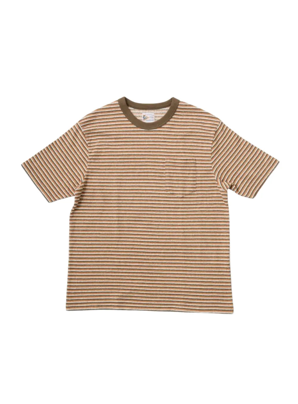 A crew neck striped pocket T-shirt. The neck is binder style. Set-in sleeves. Patch pocket on the left chest. A boxy silhouette with plenty of room. The fabric is made of soft, comfortable cotton. It is mid-weight and extremely comfortable to wear. It can be worn alone or as an inner layer.