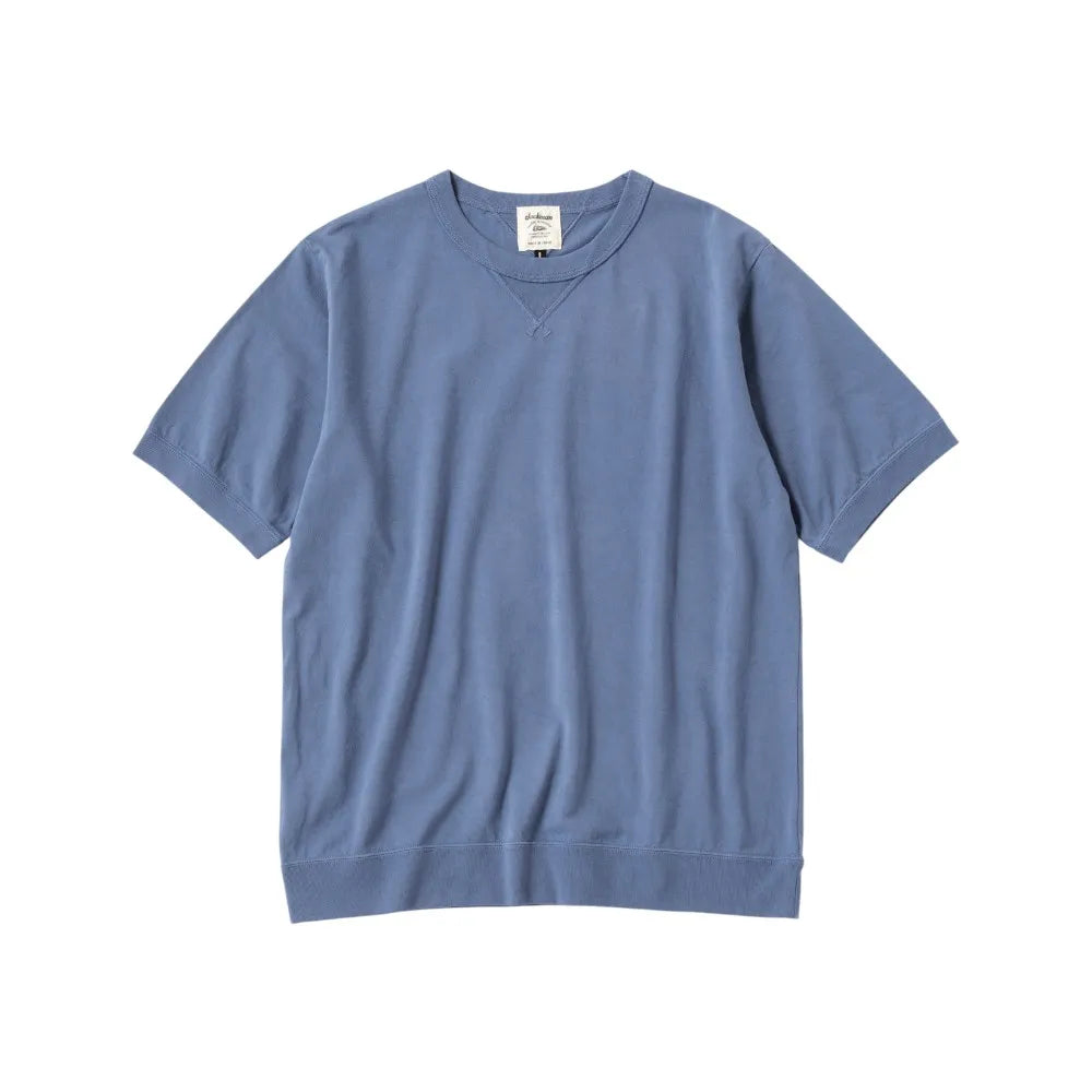 Made primarily from USA cotton produced along the Mississippi River Basin. Using a method known as air spinning, the material is made by spinning cotton thread with a variable width of between 13mm?33mm. This spinning method creates a rough feel and unique crispy texture, since the torque on the outside of the yarn is strong and the inside is weak. The sewing is the covered sewing used in sweatshirts and the front and back W gusset specification seen in vintage sweatshirts.