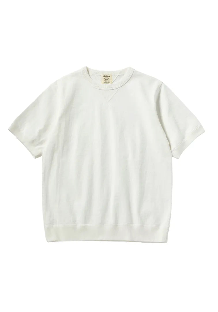 American cotton and extremely thick “Dotsume jersey” material, approximately 11.5 ounces, knitted on a loop-wheel machine with the tightest possible stitch count. Considering the compatibility with the main fabric, we used a thick rib similar to that of a sweatshirt to create a good overall balance. In addition to the reassuring appearance of being opaque, not revealing the lines of the body, and not showing sweat stains, the tight rib gives it a puffy shape like a short-sleeved sweatshirt, creating a gap between the fabric and the skin, making it comfortable to wear from spring to summer.Material
