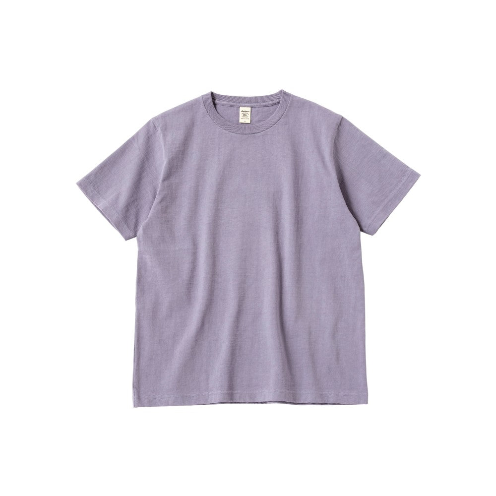 Dotsume/High-density jersey fabric is an extra-thick material of approximately 11.5 ounces, made of American cottonand knitted by loop-wheel knitting machine. As it is knitted very slowly, each knitting machine can only produce about 30 pcs for T-shirts per day, but it is characterized by its ability to evenly pack the yarn and its resistance to shrinkage and distortion even after repeated wear and washing. This T-shirt is made with ribs as thick as a sweatshirt to match the body fabric, creating a well-balanced overall look. It has the advantages of being non-transparent and sweat stains are less noticeable, and its firmness makes it less likely to cling to the skin, making it comfortable to wear. The neck is made with a binder to increase durability.