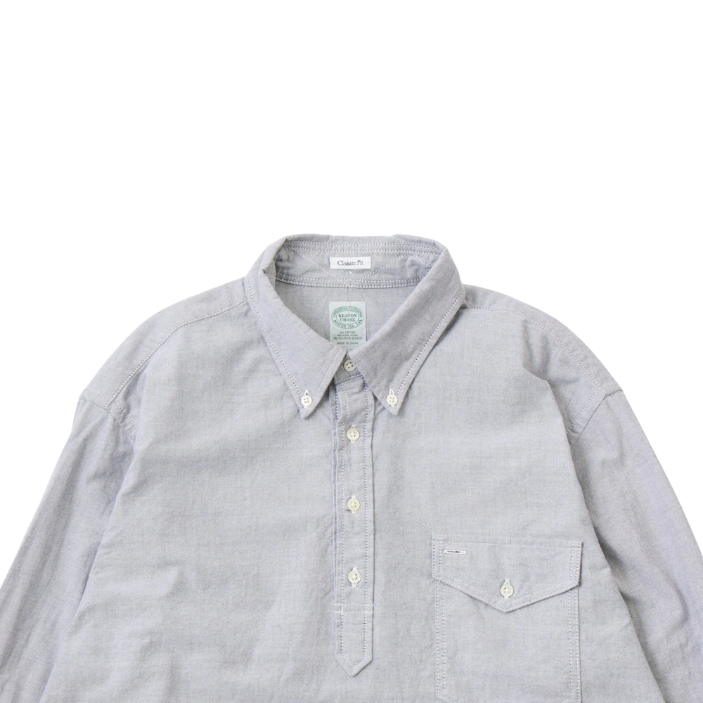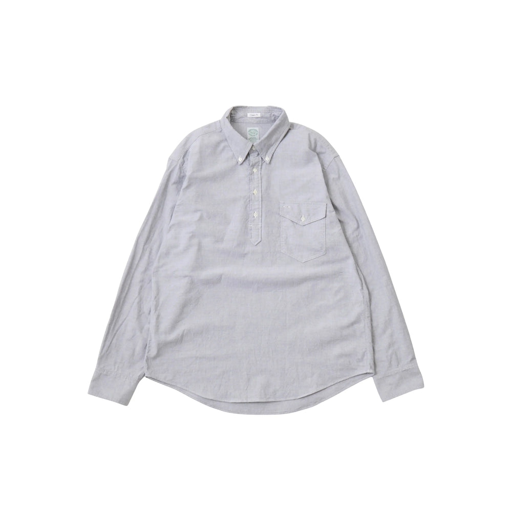A long-sleeved pullover button-down shirt produced in Japan. Crafted from smooth, lightweight Oxford fabric, it features a flap pocket on the left chest and box pleats on the back. The silhouette is a classic fit with just the right amount of room, and the cuffs feature two shell buttons for adjustable fit. The crisp button-down feel and relaxed silhouette create a stylish look. A new black colorway is available for FW25.
