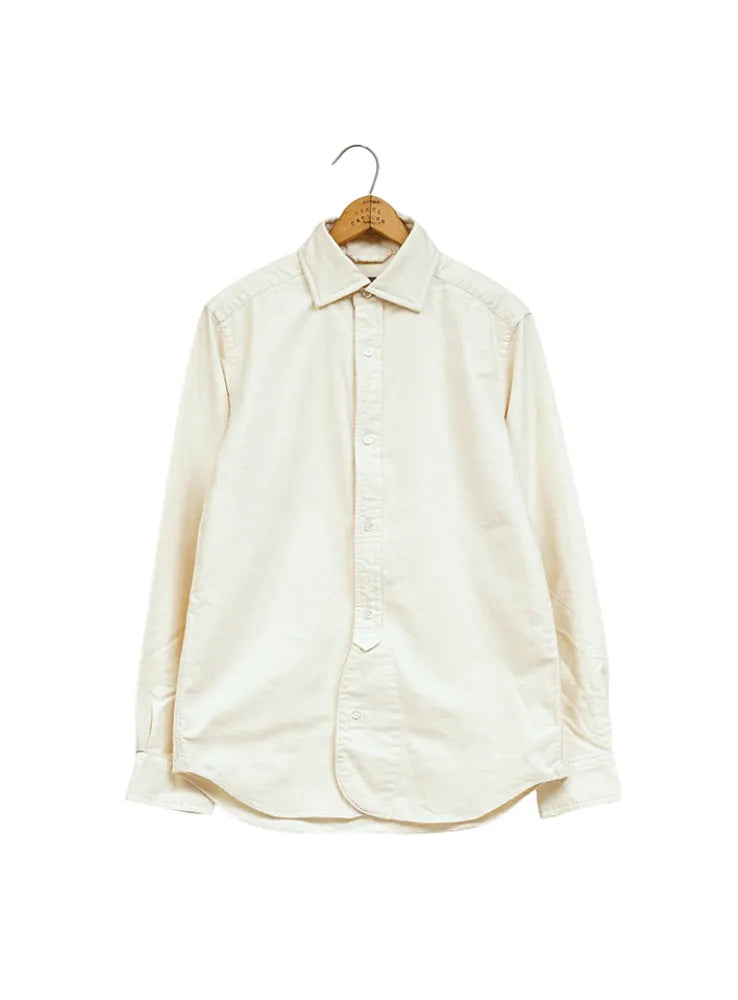 The Nigel Cabourn British Officers Shirt in Ivory features back darts and a moderately longer length through the body. The shirt has been designed to offer a slimmer and closer fit, as similar to a formal dress shirt. Expertly crafted using traditional methods and techniques, which remain unchanged since the first style of this shirt was originally produced in the 1940’s. The piece takes its inspiration from classically styled and vintage British Officer’s shirts. Purposefully made from Oxford cotton fabric, in order to create a high-quality shirt with a premium finish. The cotton has been especially developed in Japan with tightly woven yarns, creating a durable garment that is not only soft to the touch, but also incorporates a textured and natural finish. The fabric undergoes an extensive development period, which takes 6 months to ensure the shirt is built to last and become a true wardrobe staple.