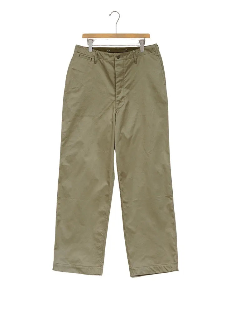 This is the New Basic Chino Pant, an updated version of the Basic Chino Pant from Nigel Cabourn’s Main Line. It’s made from a fabric that replicates the chino cloth used by military academies like West Point, known for their stricter mil-spec standards. Compared to ordinary chino cloth, this fabric offers superior durability and is less prone to distortion due to its one-wash finish. If you’re looking for high-quality military-style chinos with a classic 5-pocket design, this is highly recommended. The New Basic Chino Pant features a slightly wider waist and thigh than the previous version, resulting in a subtly tapered fit. Additionally, the corozo buttons have been replaced with urea buttons, a type historically used in military and workwear garments before the invention of plastic.