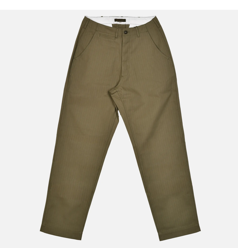 กางเกงทรงทหารที่ผลิตจากผ้า (Herringbone Twill) คุณภาพสูงตามมาตรฐาน Military Spec. ให้สัมผัสและลุคที่ใกล้เคียงกับวินเทจออริจินัล ดีเทลครบถ้วนด้วยกระดุม Marine Corp Donut Buttons แบบรีเมก เสริมด้วยงานเย็บ Double-needle wrap fold ตามสเปกกองทัพ