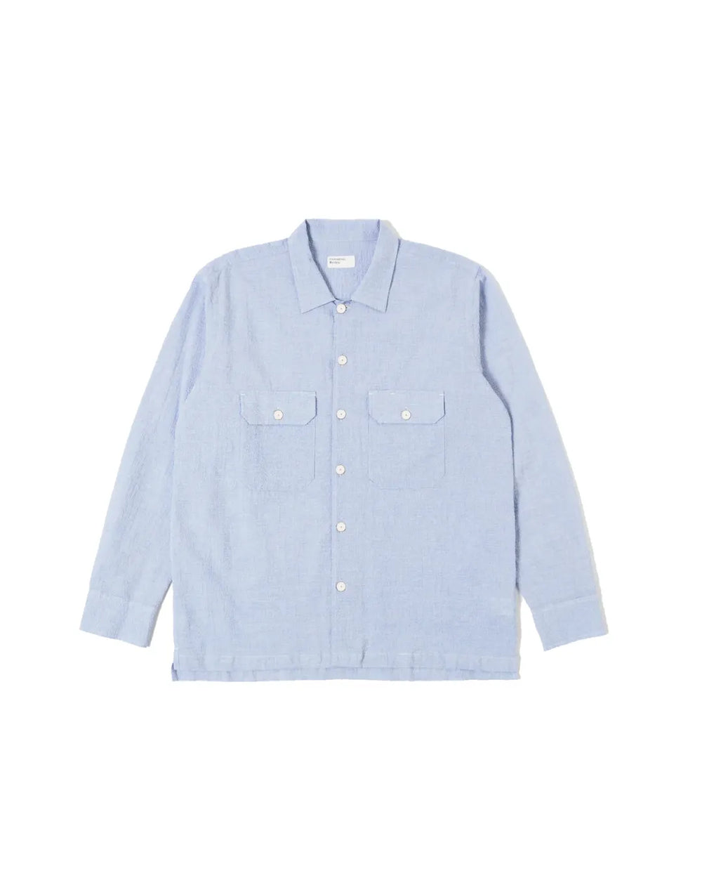 A loose fitting shirt with a flat collar, straight hem and button-flap chest pockets. It also has short split sides for a boxy loose fit, and two large pockets with button-closure flaps.