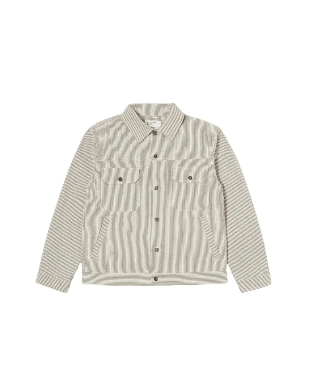 The Trucker Jacket Derby Stripe in Grey from Universal Works offers an update to a classic workwear style jacket.