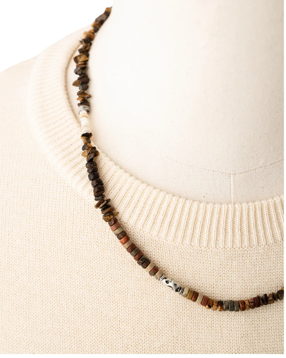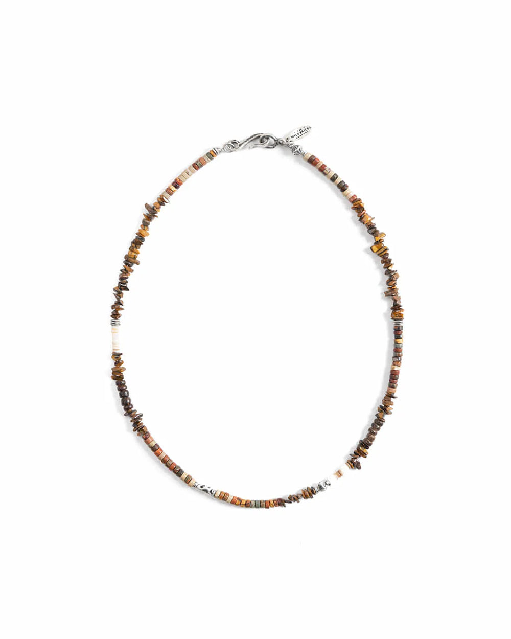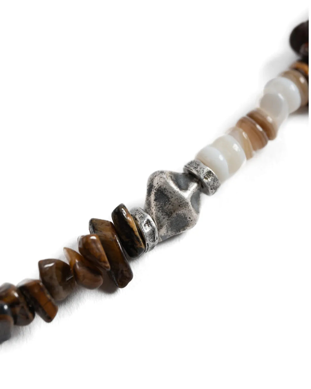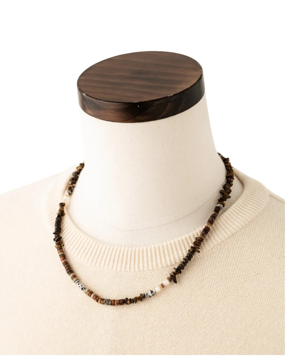 It is an ethnic necklace that harmoniously blends the textures of 3 natural stones. Self-developed hook decoration and silver beads were used. It is handmade in Korea, and it is a product that can be worn by both men and women.